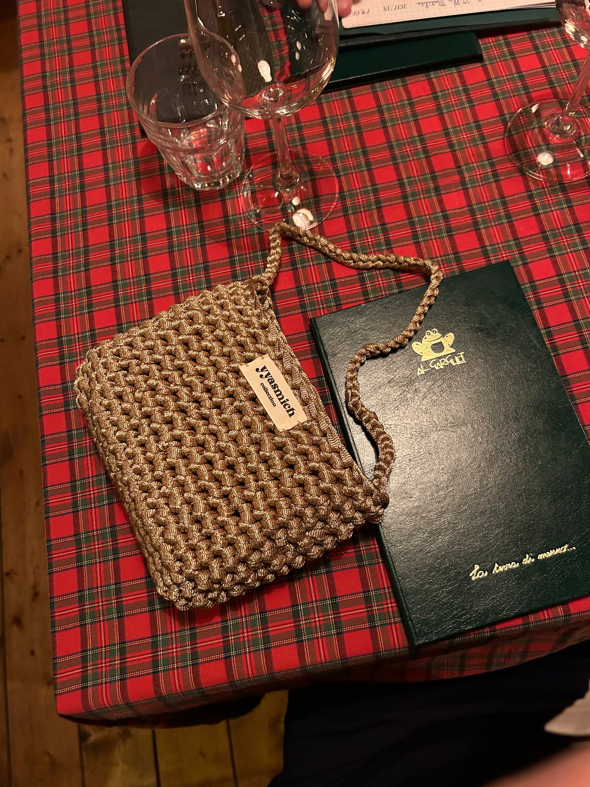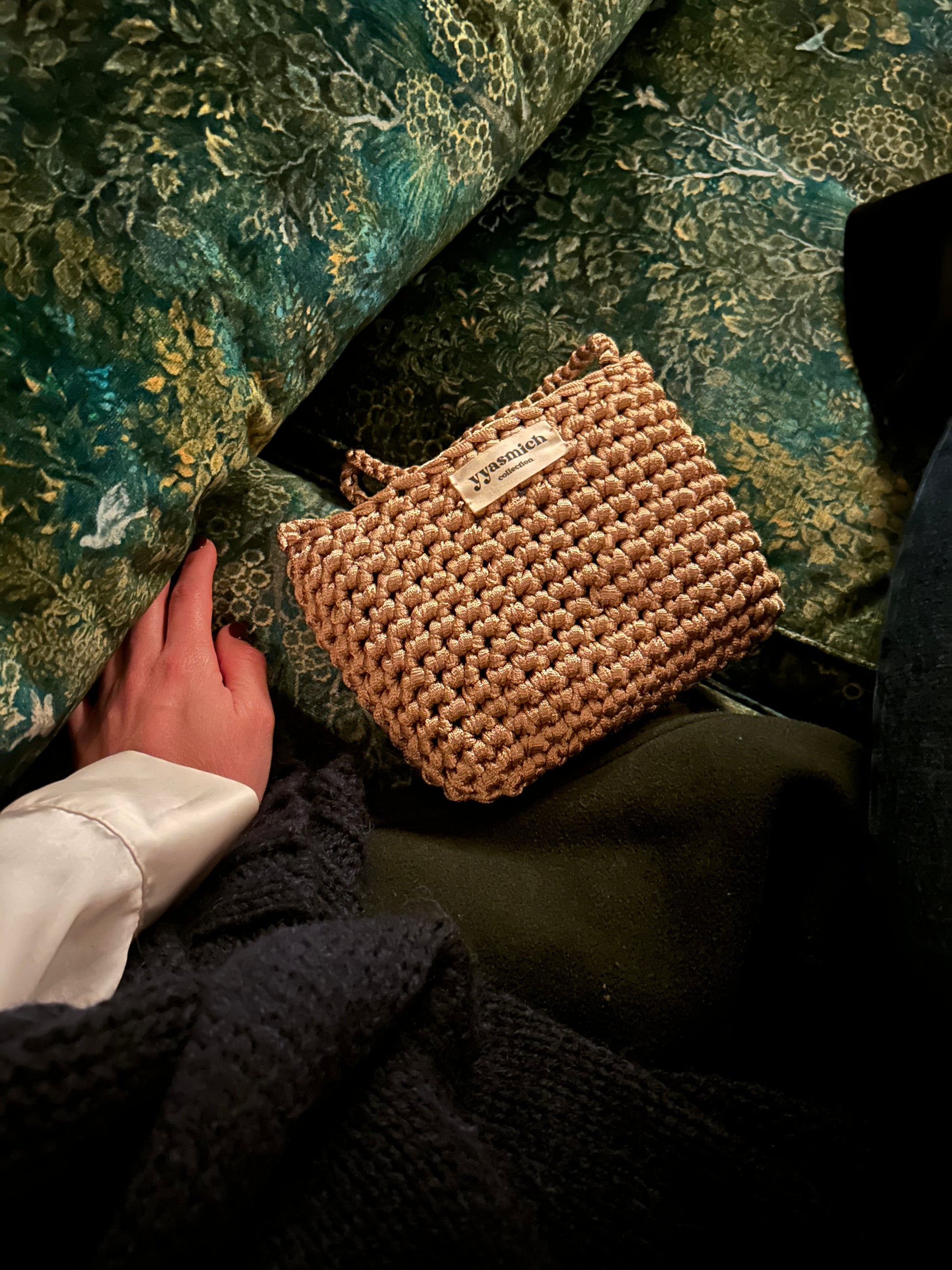 A handmade, satin gold shoulder bag, dripping with elegance.
