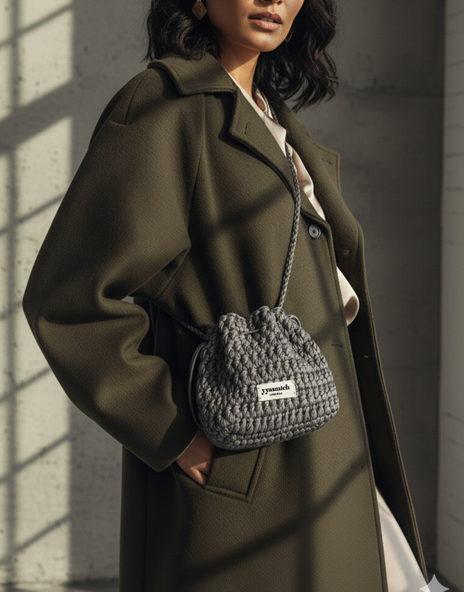 Made from grey-colored eco-leather, crocheted to combine originality, unique texture, and a focus on sustainability